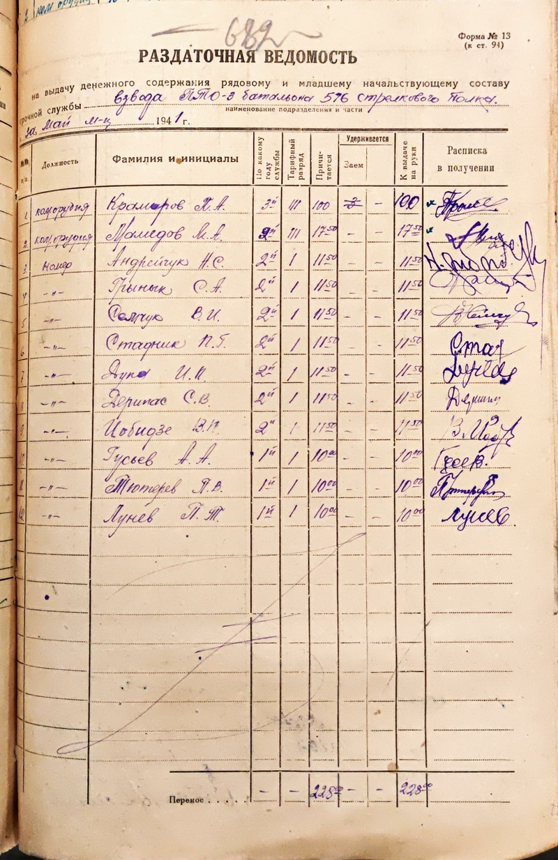 Расчётная ведомость взвода ПТО 45мм 3 батальона 576 полка за май 1941 года.