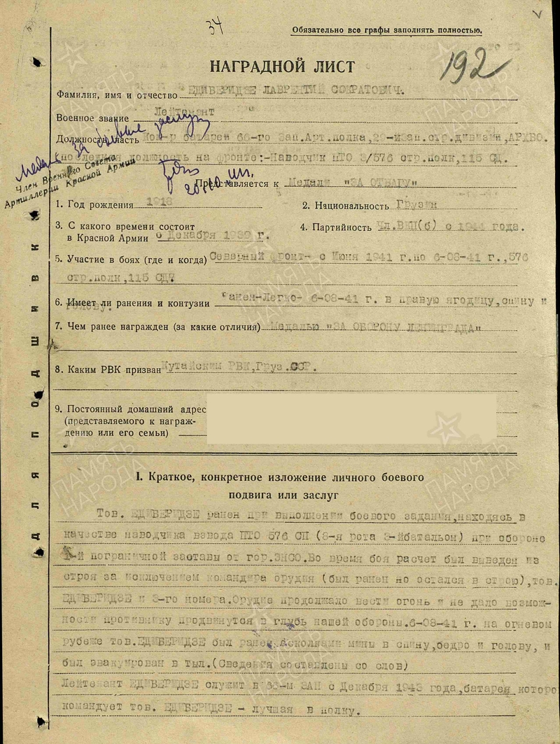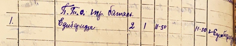 13) Орудийный номер Едиберидзе Лаврентий Сократович 16.12.1917 (1918) г.р. Призван: 07.10.1939 года, Кутаисский РВК, Грузинская ССР, Кутаисский р-н. Уроженец: Грузинская ССР, Кутаисский р-н, с. Опурчхети. Ранен в бою 06.08.1941 года. Проходит 27.08.1941 года по ЭГ1172. В дальнейшем проходит как лейтенант. Воевал. Награждён. Войну закончил в звании ст. лейтенант.