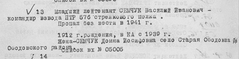 05) Орудийный номер Семчук Василий Иванович 1912 г.р. Уроженец: Винницкая обл. Призван в 1939 году. Числится мл. лейтенантом 576 СП, командиром взвода ПТР. Жена: Семчук Домна Иосифовна. По спискам потерь офицерского состава за 1946 год считается пропавшим без вести в 1941 году.
